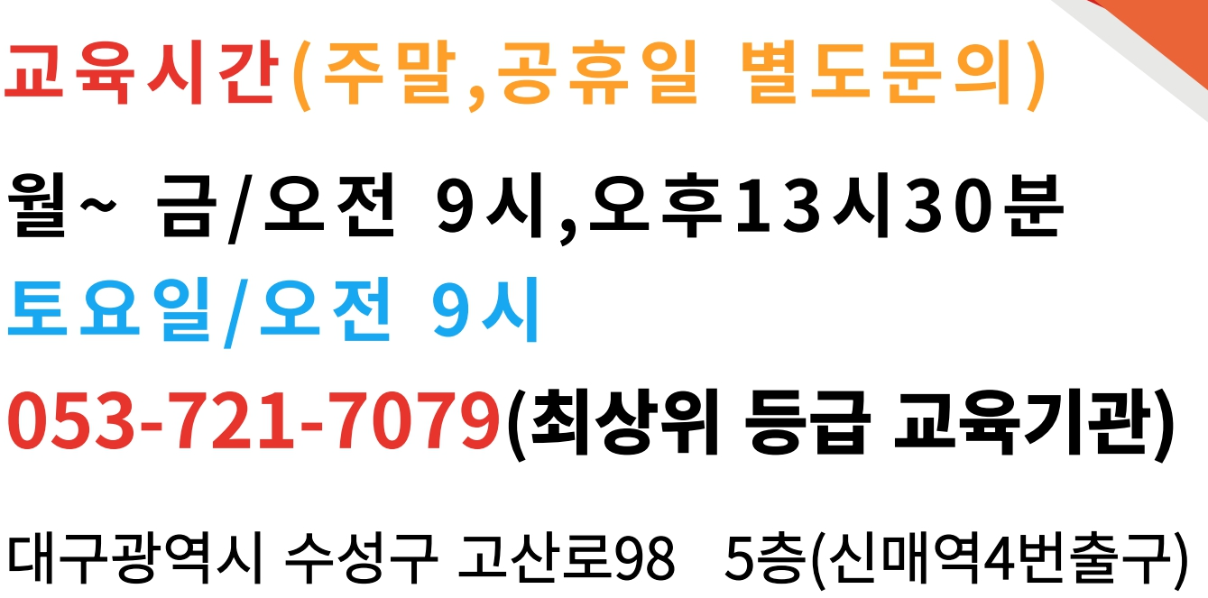 - 교육은 평일 외에 **주말(토요일)**에도 운영하는 곳이 많으므로, 평일 근무가 어려운 분들은 주말반을 활용할 수 있습니다.