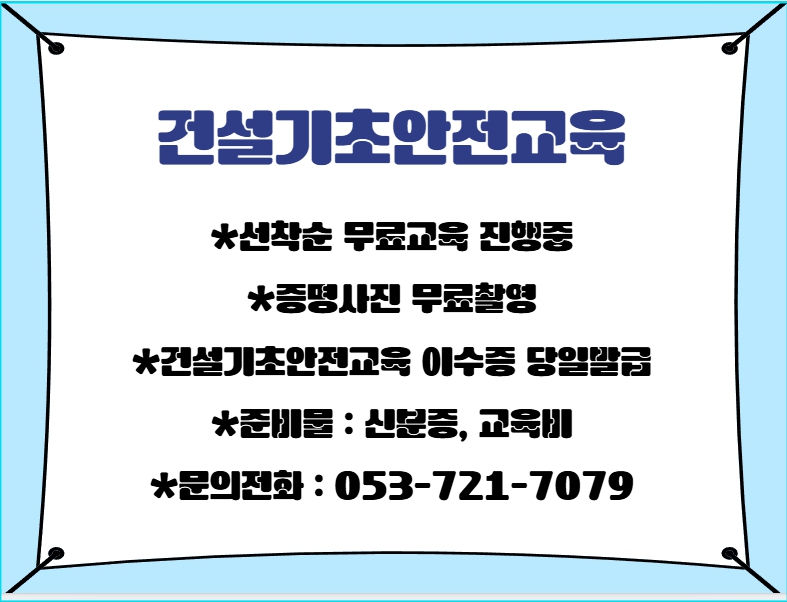 건설현장 교육장 수성구 영천 경산 청도 구미 안동 칠곡 군위 구분없이 교육장 방문 하시면 됩니다.